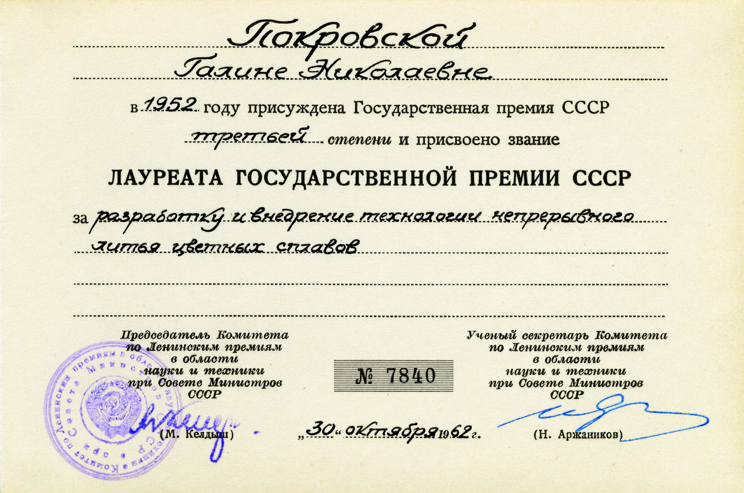 За разработку и внедрение данного метода работники завода: литейщик А.Ф. Коптев, директор завода М.Ф. Баженов и начальник центральной лаборатории Г.Н. Покровская удостоены Государственной премии 1952 г.