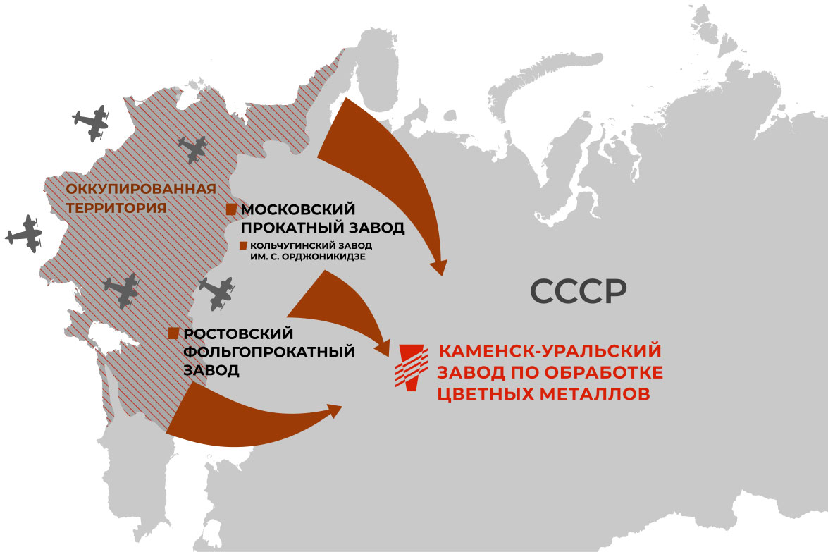 В соответствии с постановлением Совета по эвакуации и с приказом Наркома цветной металлургии СССР от 15 октября 1941 г. в район г. Каменска-Уральского в ноябре того же года были направлены первые эшелоны с оборудованием и трудящимися с заводов – Кольчугинского им. Серго Орджоникидзе, Московского прокатного и Ростовского фольгопрокатного.